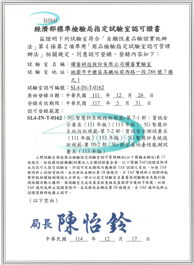 • BSMI 認可 5G 智慧杆第7-1, 7-2, 2-1, 2-2部之指定測試實驗室